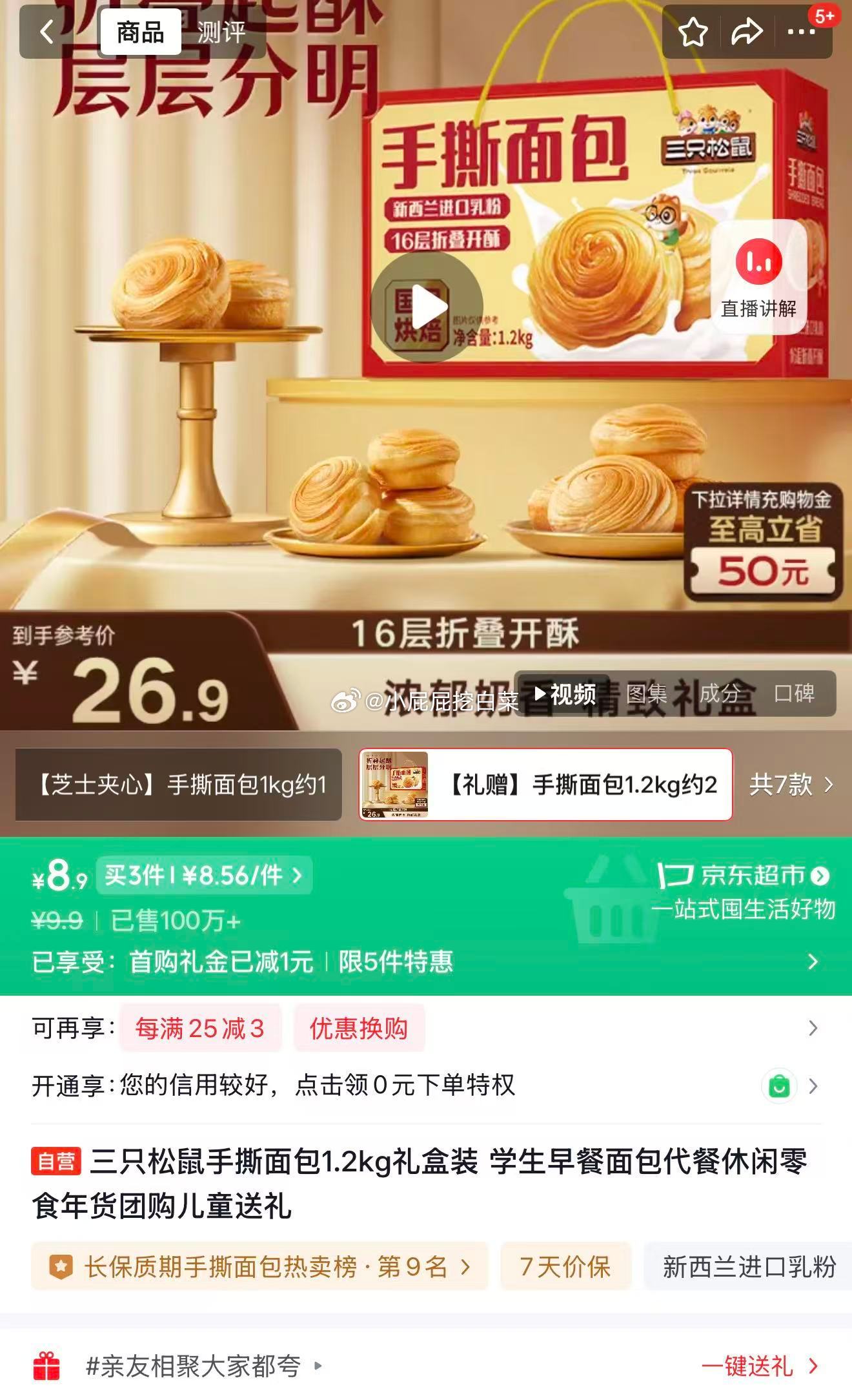 三只松鼠手撕面包1.2kg礼盒装9.9元抢购
