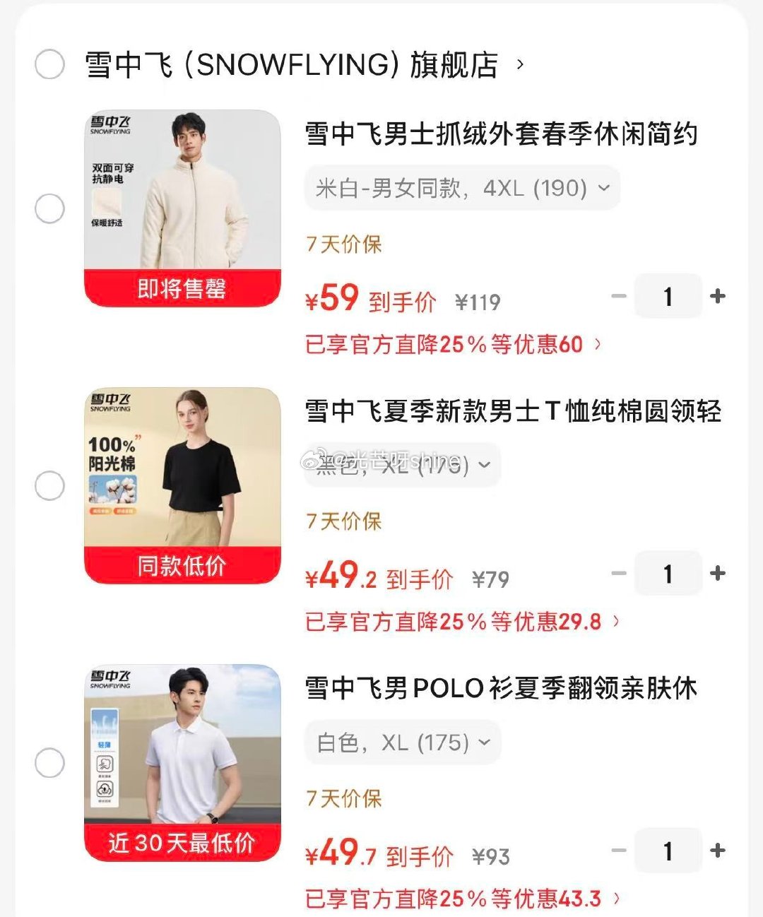 雪中飞 男士抓绒外套立领夹克上衣【59】 雪中飞男士抓绒外套春季休闲简约双面穿保暖舒适摇粒绒立领夹克上衣 米白-男女同... 雪中飞 男女士T恤纯棉圆领短袖【49】 雪中飞夏季新款男士T恤纯棉圆领轻薄亲肤柔软纯色简约短袖多色可选上衣 黑色 XL (175) 雪中飞 男POLO衫夏季翻领t恤【49】 雪中飞男POLO衫夏季翻领亲肤休闲运动柔软短袖骐骥红柔软细腻舒适t恤 白色 XL (175)