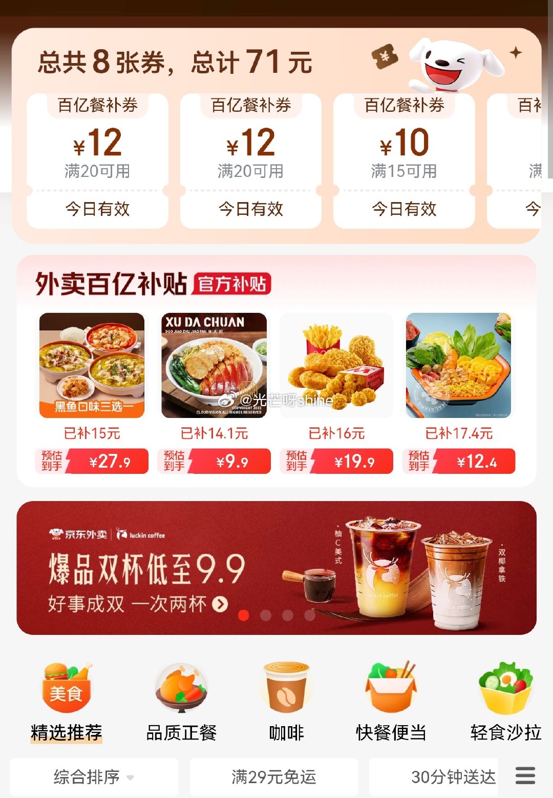 【淘宝闪购 (饿了么)】前两个会场随手领好 闪购一下会场 (88vip用这个) 网页链接 闪购品牌日会场 (所有人都能领) 网页链接 爆品好价会场 (平时没啥用) 网页链接 美团随手领券 黑钻会员中心看看 网页链接 美团品质外卖券 ,哪个券大就花哪个 网页链接 美团拼好饭 拼的多 省的多 网页链接 【京东外卖】部分有叠加券 网页链接