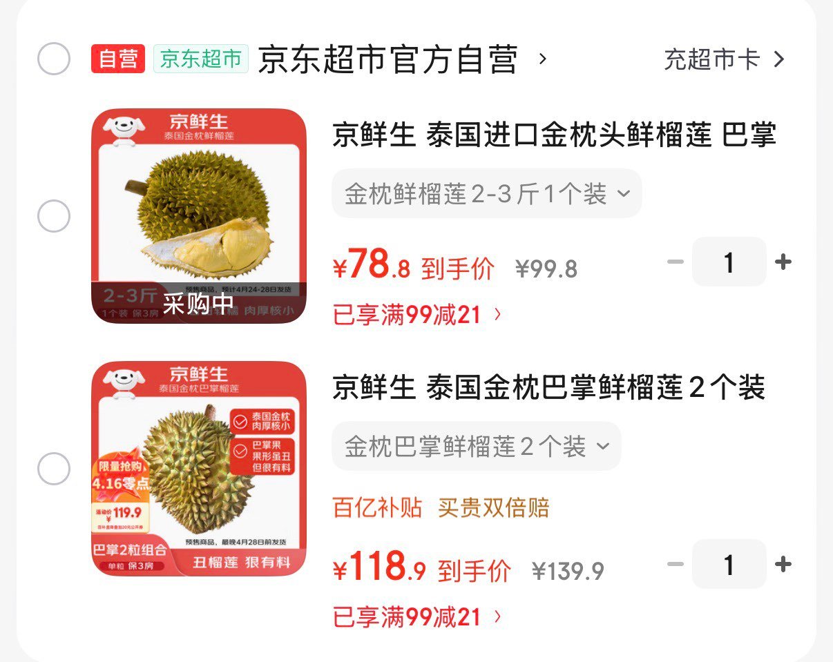 领99-21券 网页链接 京鲜生 泰国进口金枕头榴莲 78.8亓 巴掌榴莲 2-3斤 京鲜生 泰国进口金枕头鲜榴莲 巴掌榴莲 净重2-3斤 1个装 生鲜新鲜水果 118.9亓 巴掌榴莲2个单粒2-3斤保3房 总重4.5-5.5斤 京鲜生 泰国金枕巴掌鲜榴莲2个装净重4.5-5.5斤 单果2-3斤保3房源头直发