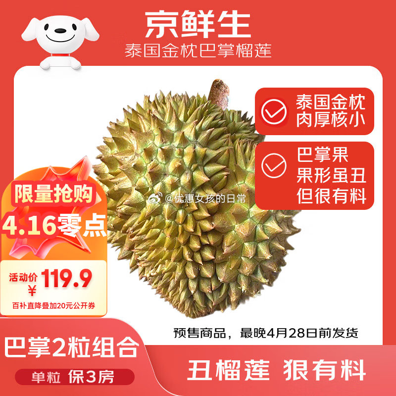 京东 领99-21券网页链接 京鲜生 泰国金枕 巴掌榴莲2个组合装单粒2-3斤保3房 总重4.5-5.5斤【117.9】 京鲜生 泰国金枕巴掌鲜榴莲2个装净重4.5-5.5斤 单果2-3斤保3房源头直发