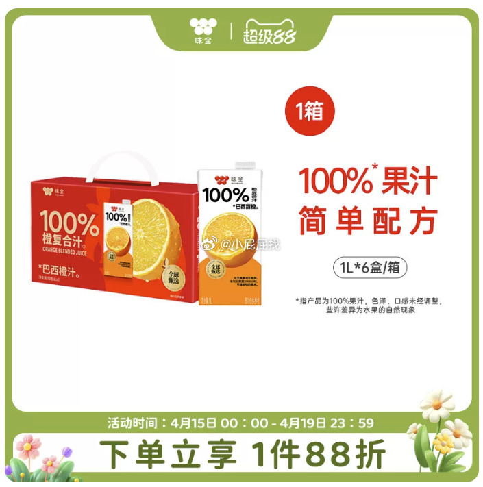 味全100%橙复合汁1L*6盒【临期】25.9元