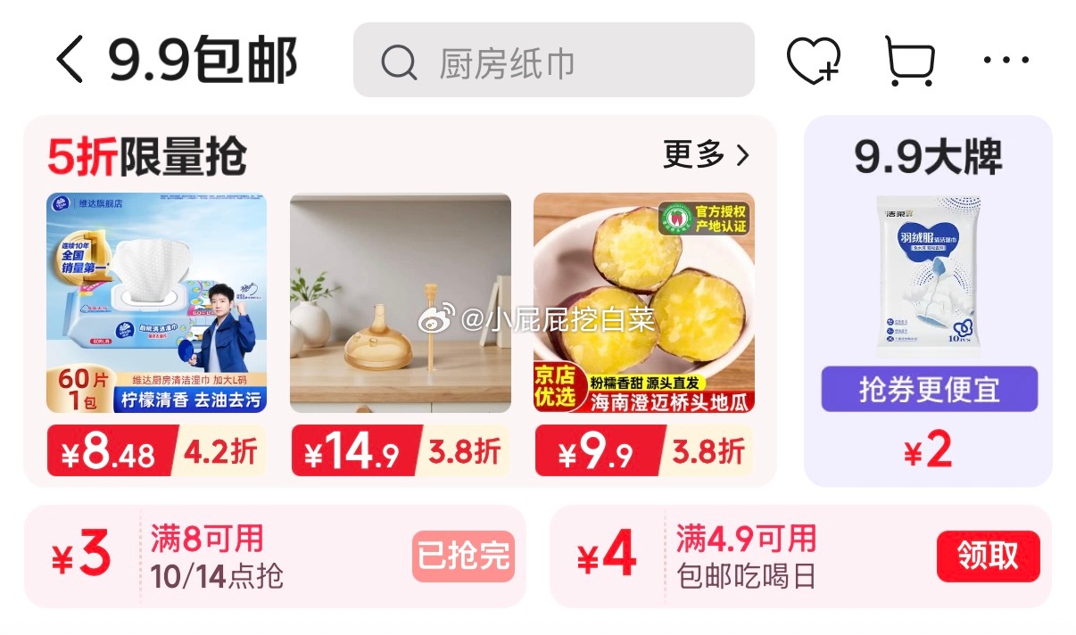 京东app搜索“便宜包邮”进9.9包邮栏,领取4.9-4券