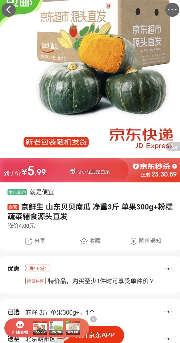 京东搜"便宜包邮"领4.9元券🔥贝贝南瓜3斤5.99元