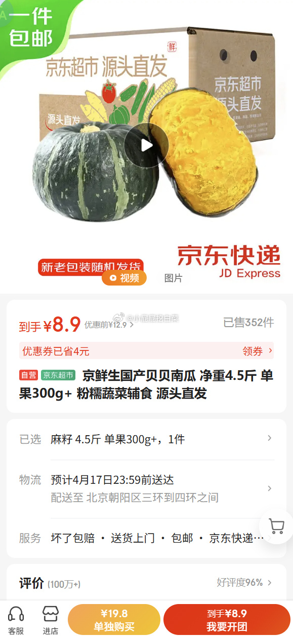 京东搜“便宜包邮”领4.9元券🎃贝贝南瓜4.5斤8.9元