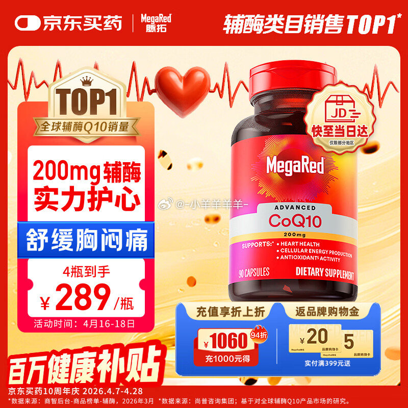 先领2张补贴券!高浓度辅酶Q10软胶囊90粒,拍4件低至275元/瓶🔥