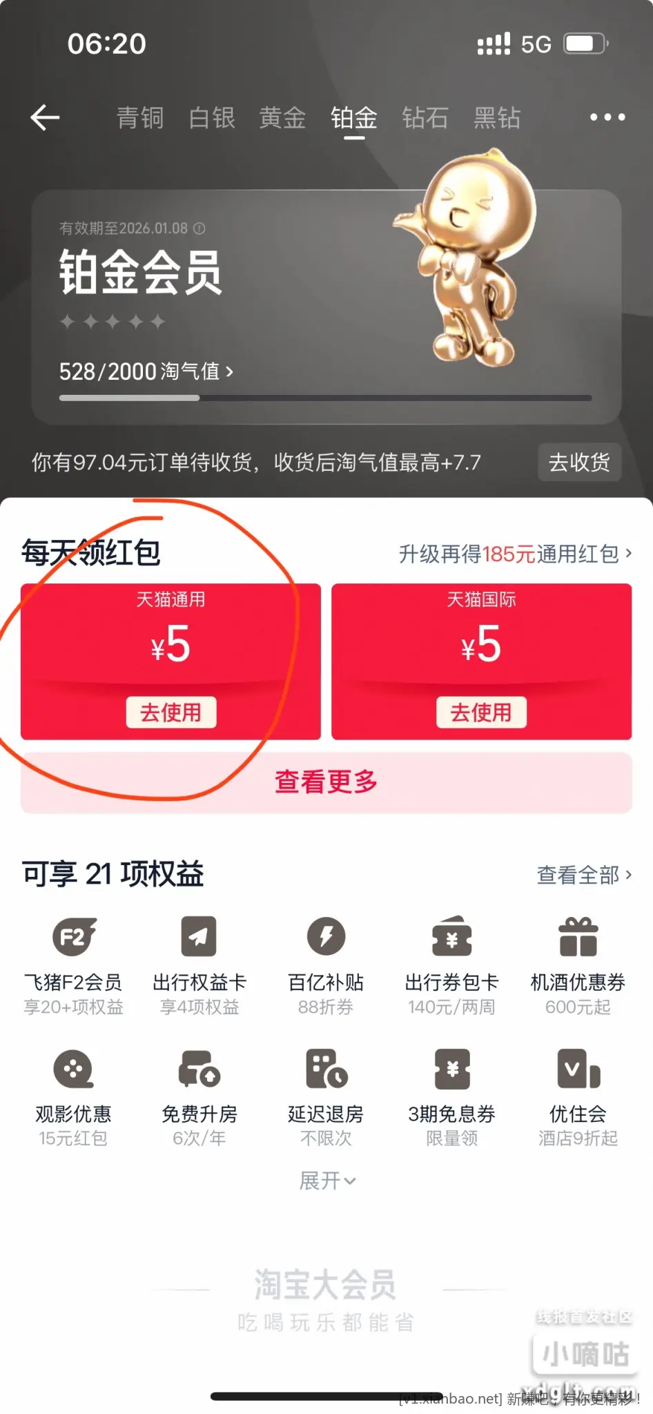 淘宝会员中心,领5元天猫通用无门槛红包,过号领取