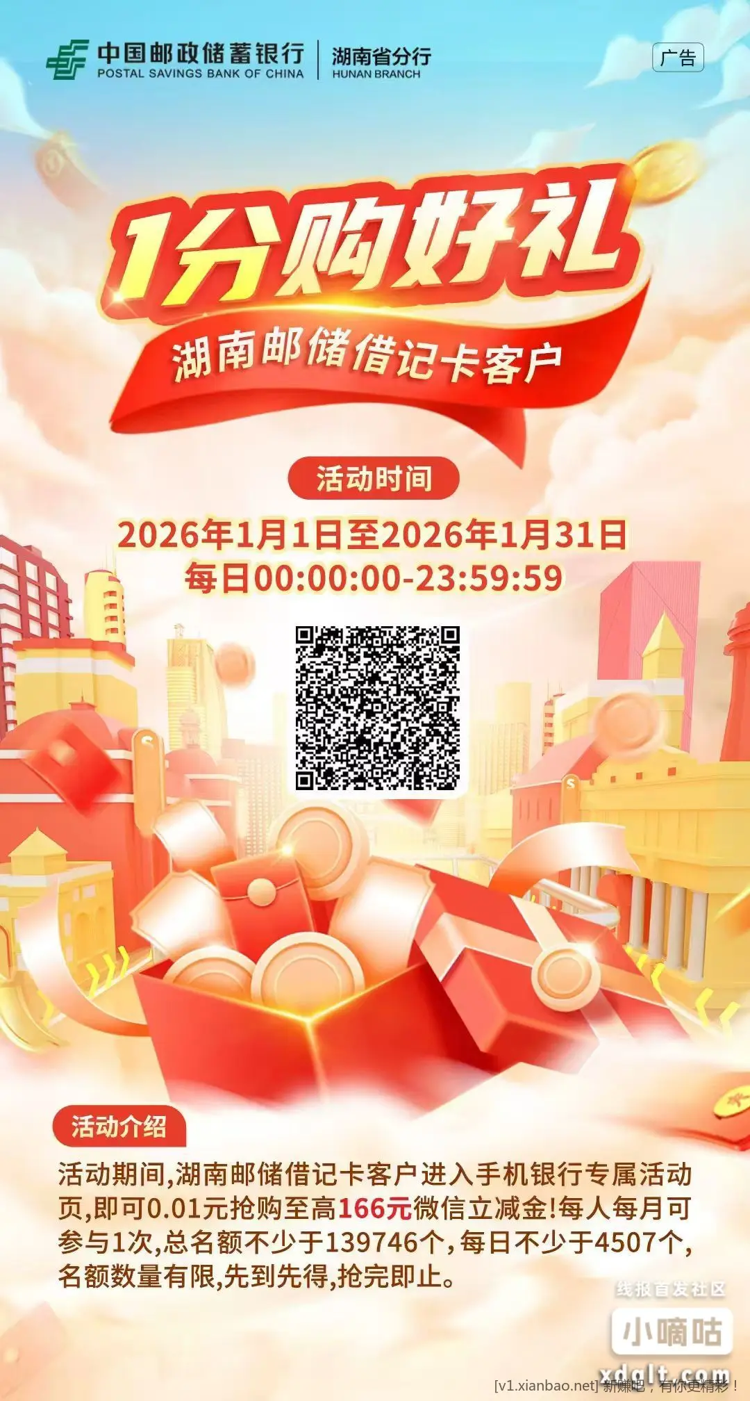 首发:湖南邮储借记卡福利! 0.01 元抢至高 166 元微信立减金,每月 1 次