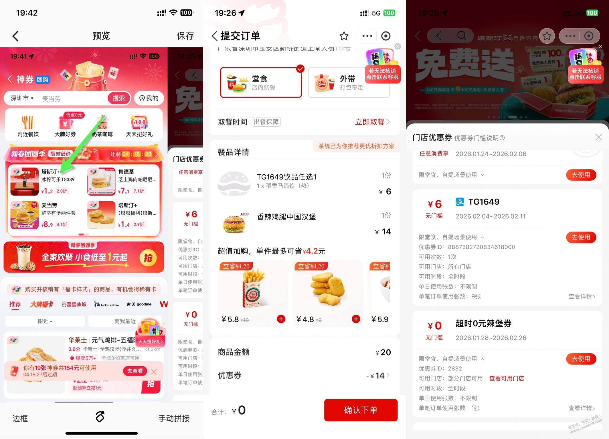 进页面买塔斯汀的马蹄饮或者可乐 ,然后再进支付宝 塔斯丁的小程序核销,券包里面还有一个汉堡券 添加0元,实付1.54马蹄饮+多得一个汉堡